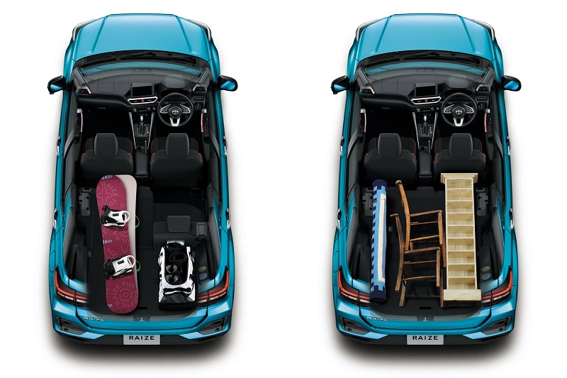 Dù chỉ là mẫu SUV cỡ A nhưng Raize 2025 vẫn có khoang hành lý tiêu chuẩn khá rộng rãi có dung tích tiêu chuẩn 369 lít. Nếu gập hàng ghế sau, dung tích có thể mở rộng tối đa 1.133 lít.